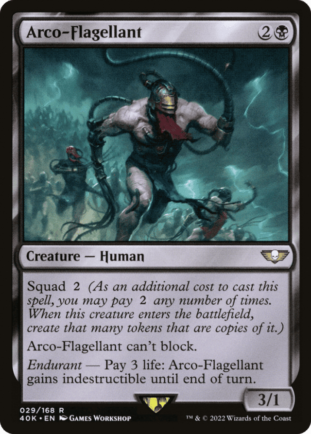 Squad {2} (As an additional cost to cast this spell, you may pay {2} any number of times. When this creature enters, create that many tokens that are copies of it.) This creature can't block. Endurant — Pay 3 life: This creature gains indestructible until end of turn.