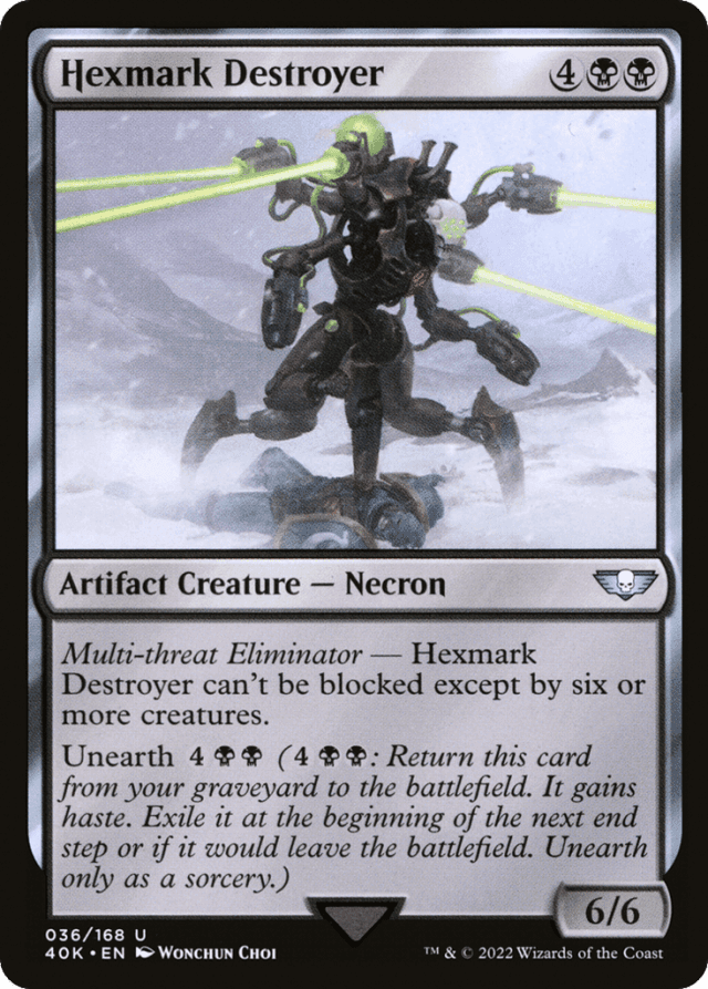 Multi-threat Eliminator — This creature can't be blocked except by six or more creatures. Unearth {4}{B}{B} ({4}{B}{B}: Return this card from your graveyard to the battlefield. It gains haste. Exile it at the beginning of the next end step or if it would leave the battlefield. Unearth only as a sorcery.)
