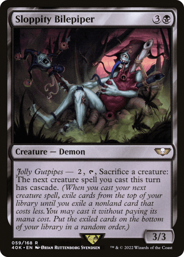 A spell's mana value is determined only by its mana cost. Ignore any alternative costs, additional costs, cost increases, or cost reductions. — As Sloppity Bilepiper's activated ability resolves, it creates a continuous effect that won't begin to apply until you start casting a creature spell this turn. It applies to that spell and the timestamp of that effect is the time that the object was put on the stack. — Cascade triggers when you cast the spell, meaning that it resolves before that spell. If you end up casting the exiled card, it will go on the stack above the spell with cascade. — Due to a 2021 rules change to cascade, not only do you stop exiling cards if you exile a nonland card with lesser mana value than the spell with cascade, but the resulting spell you cast must also have lesser mana value. Previously, in cases where a card's mana value differed from the resulting spell, such as with some modal double-faced cards or cards with an Adventure, you could cast a spell with a higher mana value than the exiled card. — If a spell with cascade is countered, the cascade ability will still resolve normally. — If the card has {X} in its mana cost, you must choose 0 as the value of X when casting it without paying its mana cost. — If you activate the ability of more than one Sloppity Bilepiper (or the same one more than once) in the same turn, the next creature spell you cast will have that many instances of cascade, each of which will trigger separately. — If you cast a card "without paying its mana cost," you can't choose to cast it for any alternative costs. You can, however, pay additional costs. If the card has any mandatory additional costs, you must pay those to cast the card. — See also "Returning Keyword Ability: Cascade" in general notes. — Two new cards in this set give the next spell you cast cascade. This means that the next spell you cast gains cascade as you begin to cast it by putting it on the stack, and the cascade ability will trigger when you finish casting that spell. — When the cascade ability resolves, you must exile cards. The only optional part of the ability is whether or not you cast the last card exiled. — You exile the cards face up. All players will be able to see them.
