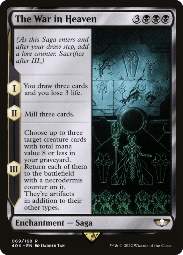(As this Saga enters and after your draw step, add a lore counter. Sacrifice after III.) I — You draw three cards and you lose 3 life. II — Mill three cards. III — Choose up to three target creature cards with total mana value 8 or less in your graveyard. Return each of them to the battlefield with a necrodermis counter on it. They're artifacts in addition to their other types.
