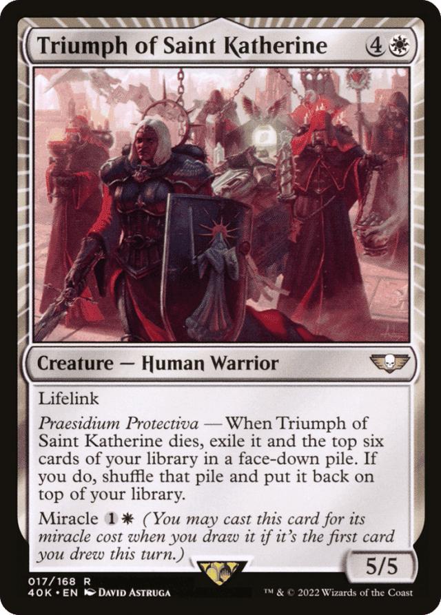 If an effect puts a card into your hand without using the word "draw," the card wasn't drawn. — If the card with miracle leaves your hand before the triggered ability resolves, you won't be able to cast it using its miracle ability. — It's important to reveal a card with miracle before it is mixed with the other cards in your hand. — Miracle is an alternative cost to cast the spell with miracle. It can't be combined with other alternative costs, such as casting a spell "without paying its mana cost." — Multiple card draws are always treated as a sequence of individual card draws. For example, if you haven't drawn any cards yet during a turn and cast a spell that instructs you to draw three cards, you'll draw them one at a time. Only the first card drawn this way may be revealed and cast using its miracle ability. — To determine the total cost of a spell, start with the mana cost or alternative cost (such as a miracle cost) you're paying, add any cost increases, then apply any cost reductions. The mana value of the spell remains unchanged, no matter what the total cost to cast it was. — You can cast a card for its miracle cost only as the miracle triggered ability resolves. If you don't want to cast it at that time (or you can't cast it, perhaps because there are no legal targets available), you won't be able to cast it later for the miracle cost. — You can reveal and cast a card with miracle on any turn, not just your own, if it's the first card you've drawn that turn. — You cast the card with miracle during the resolution of the triggered ability. Ignore any timing rules based on the card's type. — You don't have to reveal a drawn card with miracle if you don't wish to cast it at that time. — You still draw the card, whether you use the miracle ability or not. Any ability that triggers whenever you draw a card, for example, will trigger. If you don't cast the card using its miracle ability, it will remain in your hand. — If you have fewer than six cards in your library or if Triumph of Saint Katherine isn't in your graveyard as the triggered ability resolves, no cards will be exiled and the ability will do nothing.
