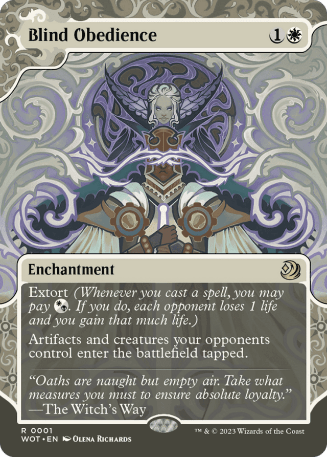 Extort (Whenever you cast a spell, you may pay {W/B}. If you do, each opponent loses 1 life and you gain that much life.) Artifacts and creatures your opponents control enter tapped.
