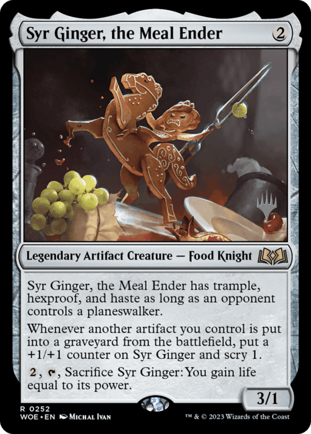 Syr Ginger has trample, hexproof, and haste as long as an opponent controls a planeswalker. Whenever another artifact you control is put into a graveyard from the battlefield, put a +1/+1 counter on Syr Ginger and scry 1. {2}, {T}, Sacrifice Syr Ginger: You gain life equal to its power.
