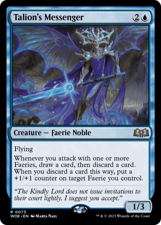 Flying Whenever you attack with one or more Faeries, draw a card, then discard a card. When you discard a card this way, put a +1/+1 counter on target Faerie you control.