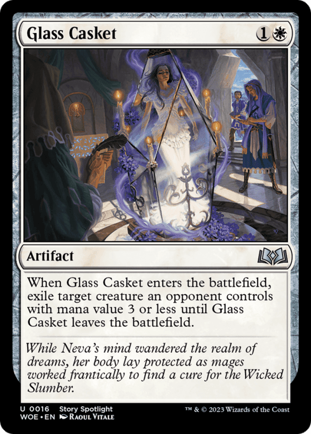 Auras attached to the exiled creature will be put into their owners' graveyards. Any Equipment will become unattached and remain on the battlefield. Any counters on the exiled creature will cease to exist. When the card returns to the battlefield, it will be a new object with no connection to the card that was exiled. — If Glass Casket leaves the battlefield before its triggered ability resolves, the target creature won't be exiled. — If a token is exiled this way, it will cease to exist and won't return to the battlefield. — Auras attached to the exiled creature will be put into their owners' graveyards. Any Equipment will become unattached and remain on the battlefield. Any counters on the exiled creature will cease to exist. When the card returns to the battlefield, it will be a new object with no connection to the card that was exiled. — If Glass Casket leaves the battlefield before its triggered ability resolves, the target creature won't be exiled. — If a token is exiled this way, it will cease to exist and won't return to the battlefield.