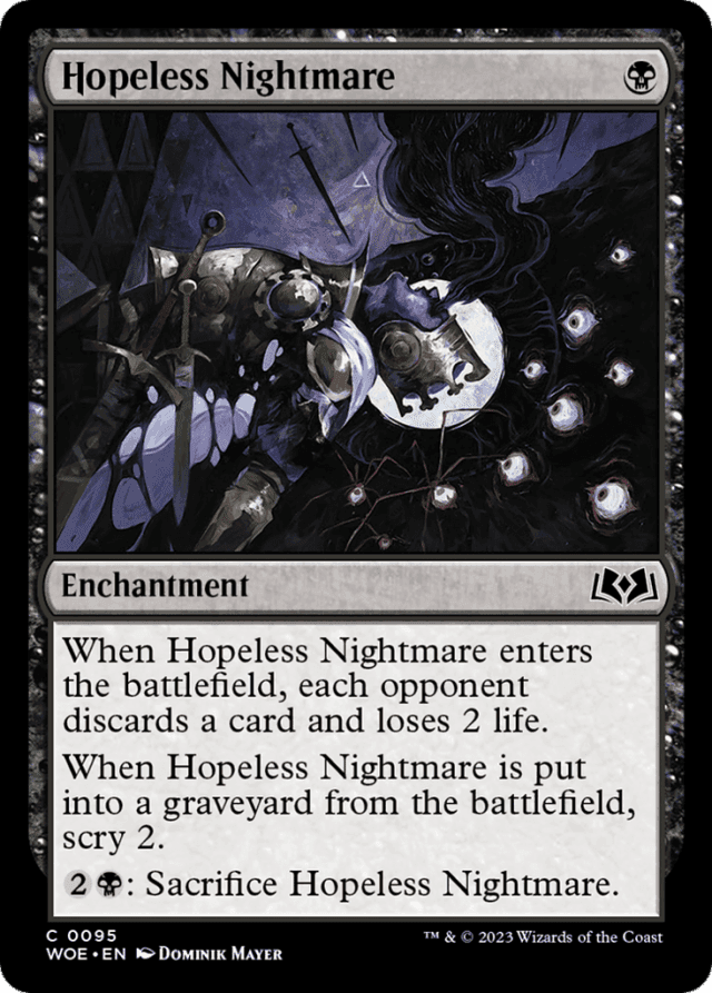 When this enchantment enters, each opponent discards a card and loses 2 life. When this enchantment is put into a graveyard from the battlefield, scry 2. {2}{B}: Sacrifice this enchantment.