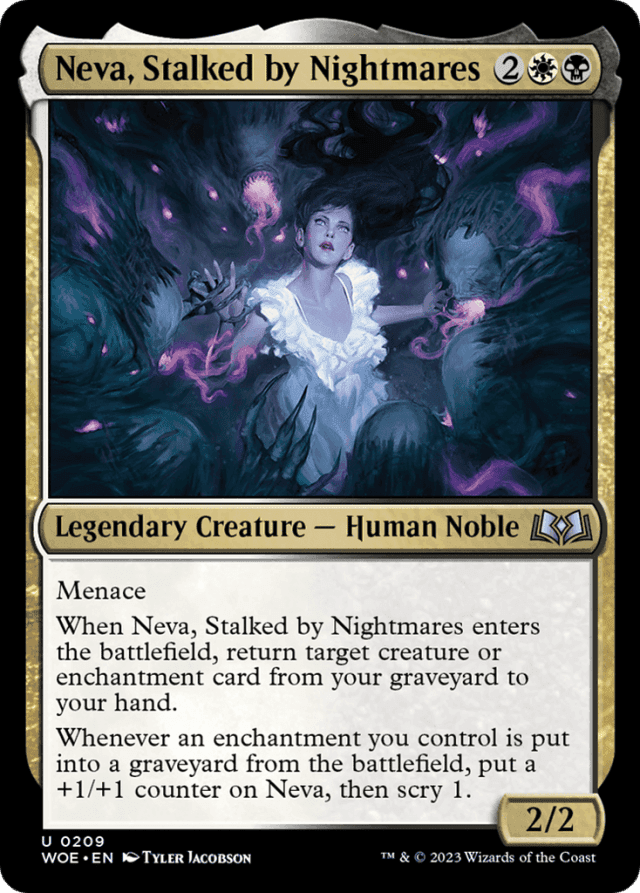 Menace When Neva enters, return target creature or enchantment card from your graveyard to your hand. Whenever an enchantment you control is put into a graveyard from the battlefield, put a +1/+1 counter on Neva, then scry 1.