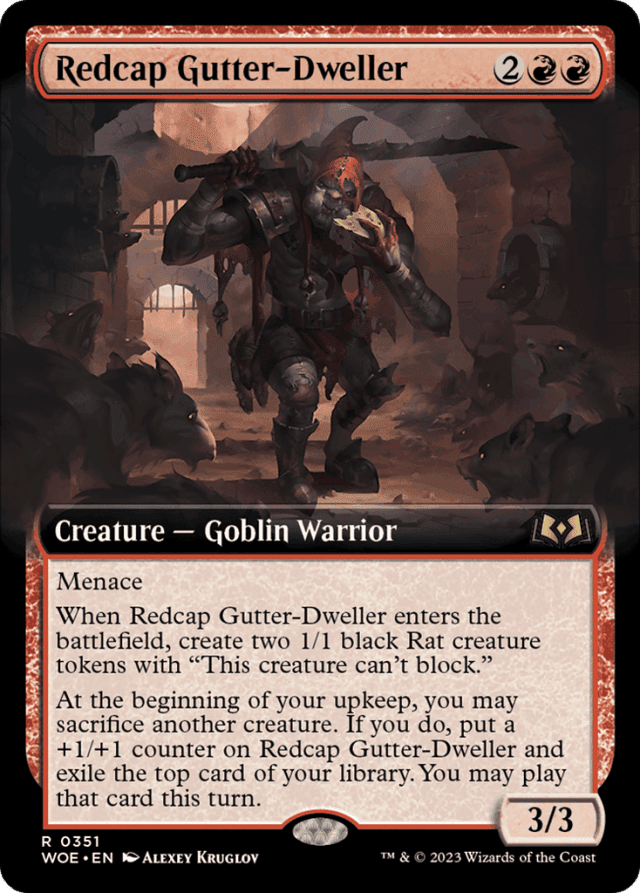 Menace When this creature enters, create two 1/1 black Rat creature tokens with "This token can't block." At the beginning of your upkeep, you may sacrifice another creature. If you do, put a +1/+1 counter on this creature and exile the top card of your library. You may play that card this turn.