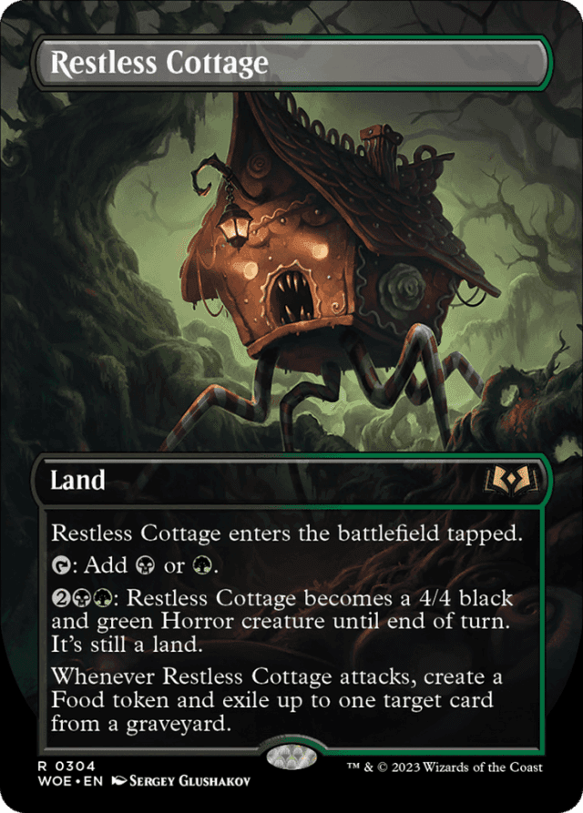 This land enters tapped. {T}: Add {B} or {G}. {2}{B}{G}: This land becomes a 4/4 black and green Horror creature until end of turn. It's still a land. Whenever this land attacks, create a Food token and exile up to one target card from a graveyard.