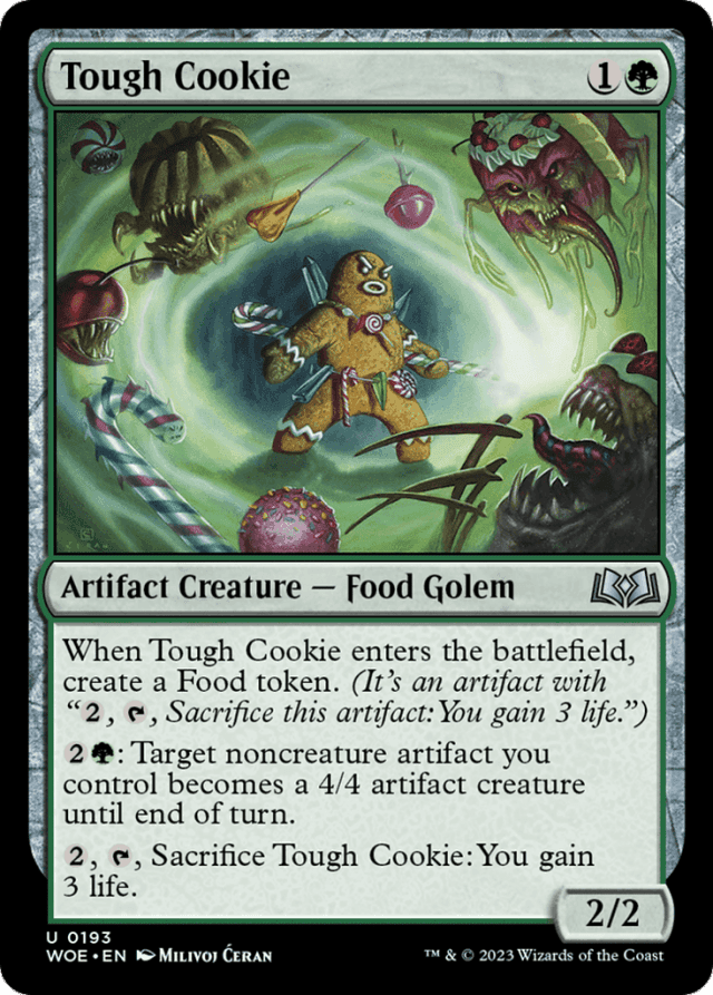 As Tough Cookie's second ability resolves, the target permanent keeps any other types and subtypes it had before it became an artifact creature. — Food is an artifact type. Even though it appears on some creatures, it's never a creature type. — Whatever you do, don't eat the delicious cards. — You can't sacrifice a Food to pay multiple costs. For example, you can't sacrifice a Food token to activate its own ability and also to activate Maraleaf Rider's ability.