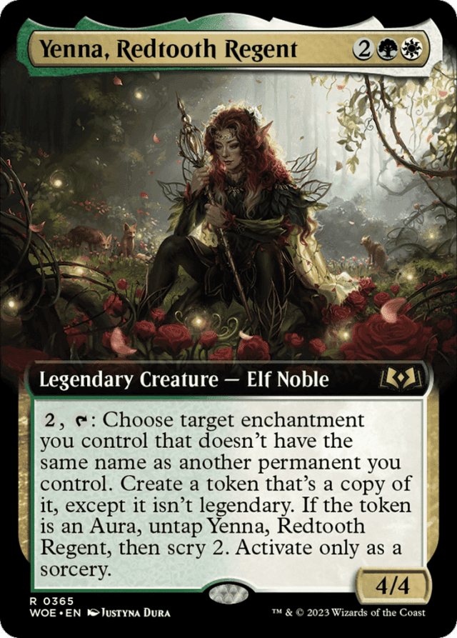 {2}, {T}: Choose target enchantment you control that doesn't have the same name as another permanent you control. Create a token that's a copy of it, except it isn't legendary. If the token is an Aura, untap Yenna, then scry 2. Activate only as a sorcery.