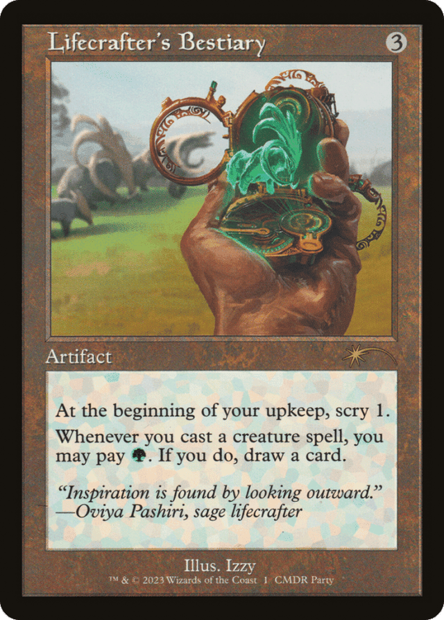 Lifecrafter's Bestiary's second triggered ability resolves before the spell that caused it to trigger. The ability will resolve even if that spell is countered. — The draw step is after the upkeep step, so you'll scry 1 before you draw for the turn. — While resolving Lifecrafter's Bestiary's second triggered ability, you can't pay {G} multiple times to draw multiple cards.