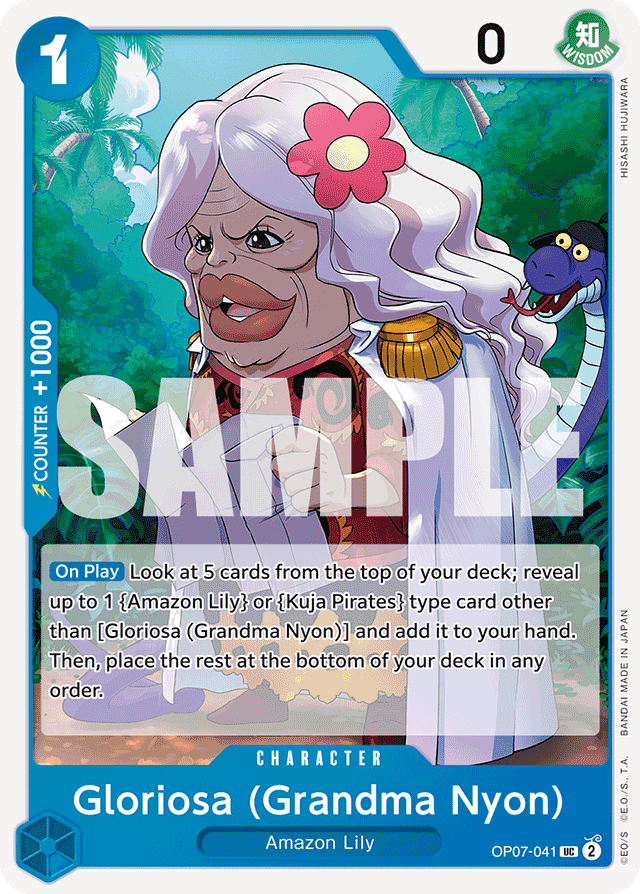 [On Play] Look at 5 cards from the top of your deck; reveal up to 1 {Amazon Lily} or {Kuja Pirates} type card other than [Gloriosa (Grandma Nyon)] and add it to your hand. Then, place the rest at the bottom of your deck in any order.