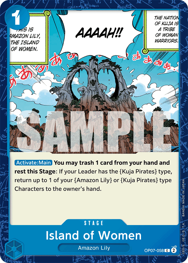 [Activate: Main] You may trash 1 card from your hand and rest this Stage: If your Leader has the {Kuja Pirates} type, return up to 1 of your {Amazon Lily} or {Kuja Pirates} type Characters to the owner's hand.