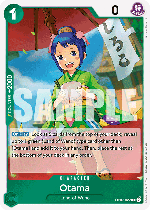 [On Play] Look at 5 cards from the top of your deck; reveal up to 1 green {Land of Wano} type card other than [Otama] and add it to your hand. Then, place the rest at the bottom of your deck in any order.