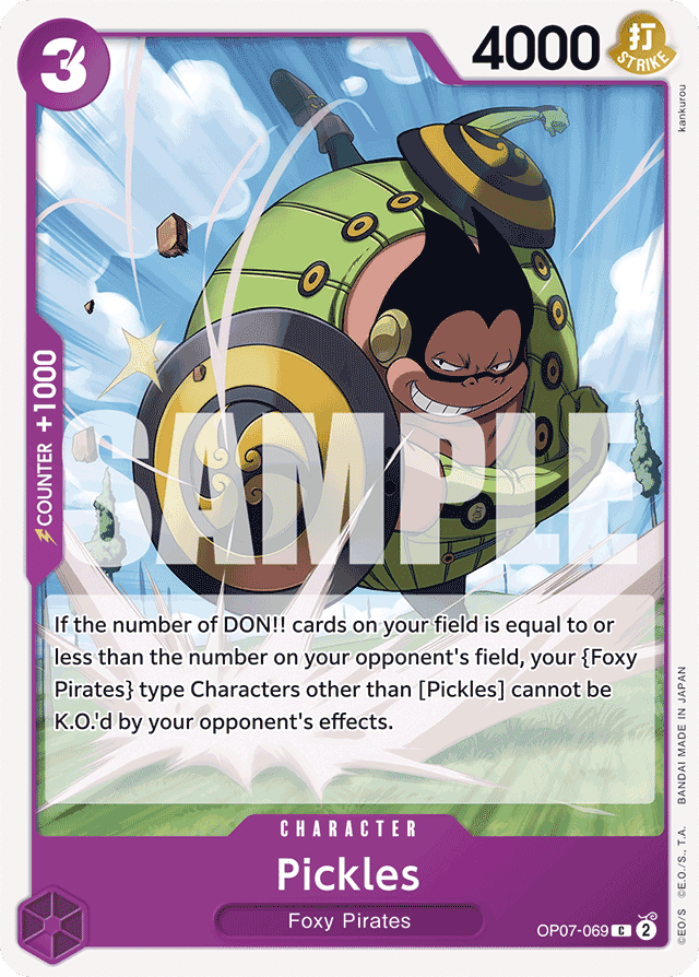 If the number of DON!! cards on your field is equal to or less than the number on your opponent's field, your {Foxy Pirates} type Characters other than [Pickles] cannot be K.O.'d by your opponent's effects.