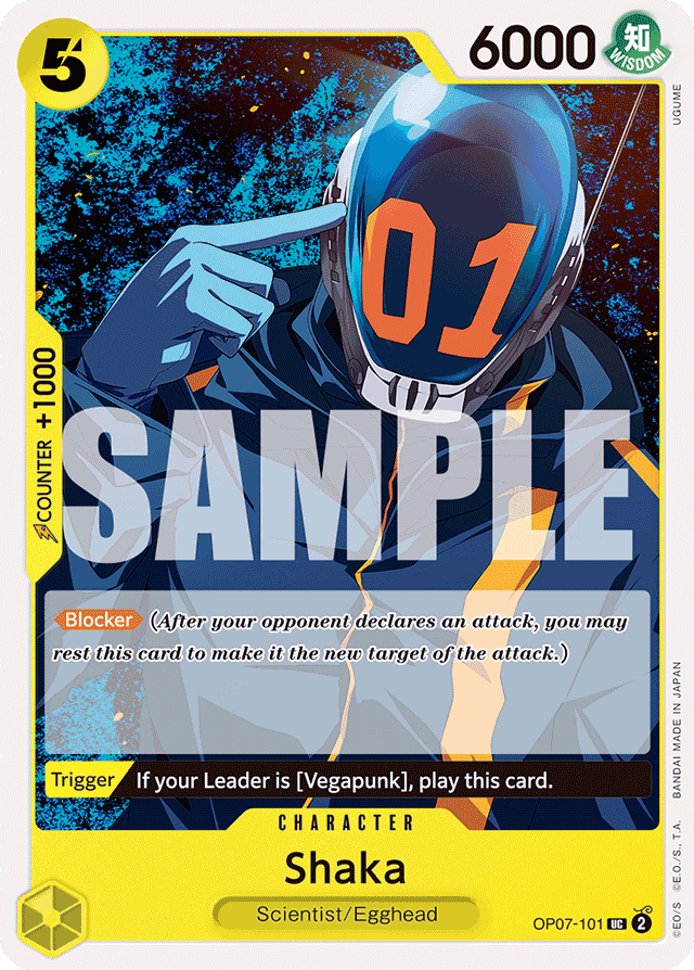 [Blocker] (After your opponent declares an attack, you may rest this card to make it the new target of the attack.) [Trigger] If your Leader is [Vegapunk], play this card.