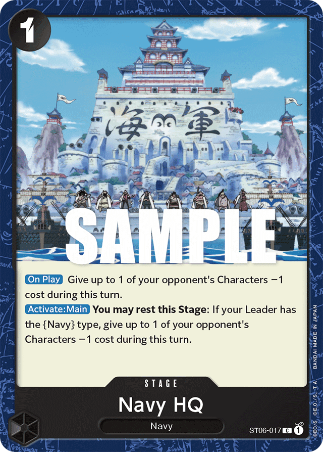 [On Play] Give up to 1 of your opponent's Characters −1 cost during this turn. [Activate: Main] You may rest this Stage: If your Leader has the {Navy} type, give up to 1 of your opponent's Characters −1 cost during this turn.