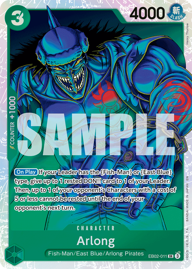 [On Play] If your Leader has the {Fish-Man} or {East Blue} type, give up to 1 rested DON!! card to 1 of your Leader. Then, up to 1 of your opponent's Characters with a cost of 5 or less cannot be rested until the end of your opponent's next turn.