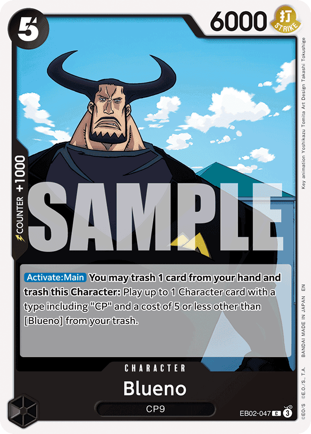 [Activate: Main] You may trash 1 card from your hand and trash this Character: Play up to 1 Character card with a type including "CP" and a cost of 5 or less other than [Blueno] from your trash.