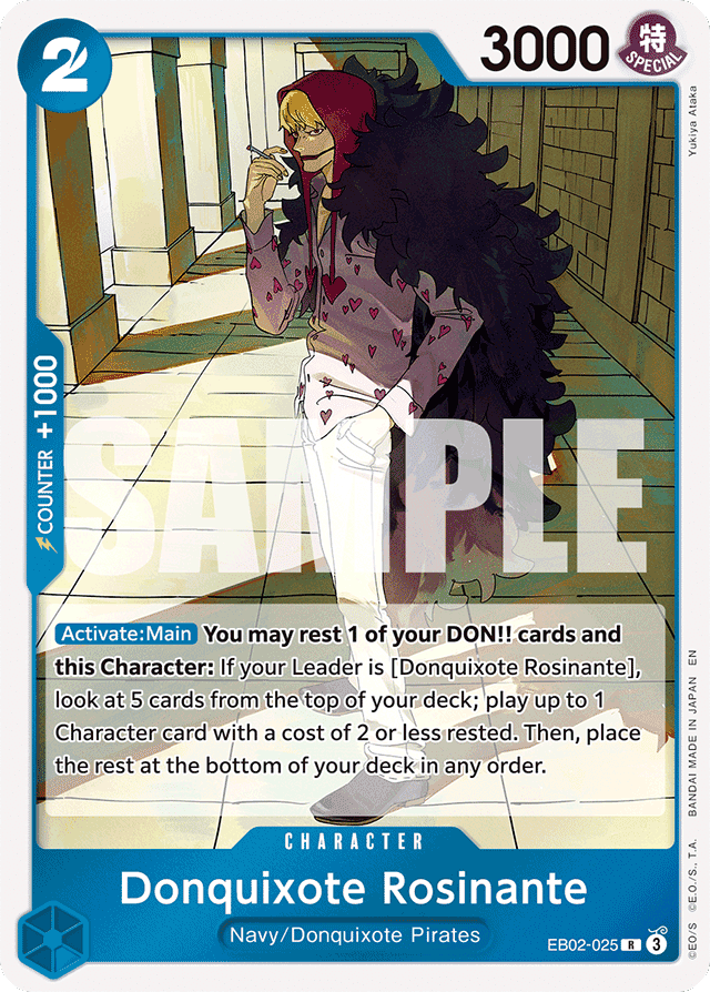 [Activate: Main] You may rest 1 of your DON!! cards and this Character: If your Leader is [Donquixote Rosinante], look at 5 cards from the top of your deck; play up to 1 Character card with a cost of 2 or less rested. Then, place the rest at the bottom of your deck in any order.