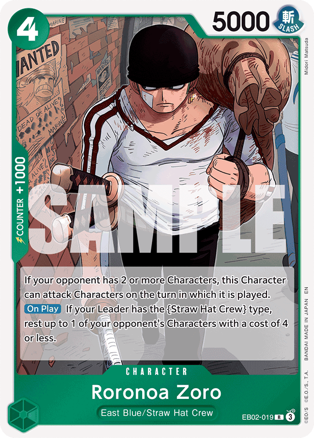 If your opponent has 2 or more Characters, this Character can attack Characters on the turn in which it is played. [On Play] If your Leader has the {Straw Hat Crew} type, rest up to 1 of your opponent's Characters with a cost of 4 or less.