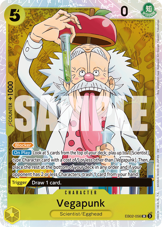 [Blocker] [On Play] Look at 5 cards from the top of your deck; play up to 1 {Scientist} type Character card with a cost of 5 or less other than [Vegapunk]. Then, place the rest at the bottom of your deck in any order and if your opponent has 2 or less Characters, trash 1 card from your hand. [Trigger] Draw 1 card.
