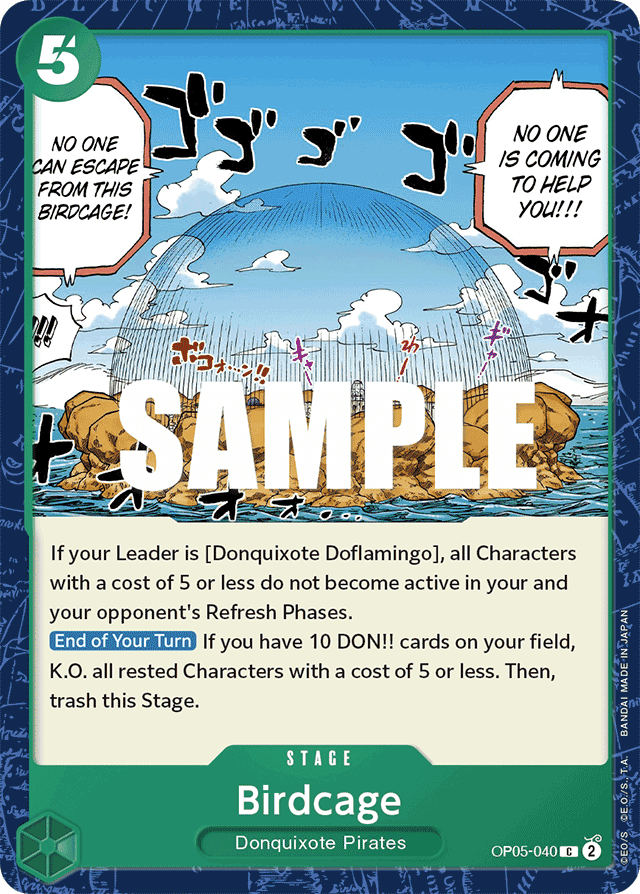 If your Leader is [Donquixote Doflamingo], all Characters with a cost of 5 or less do not become active in your and your opponent's Refresh Phases. [End of Your Turn] If you have 10 DON!! cards on your field, K.O. all rested Characters with a cost of 5 or less. Then, trash this Stage.