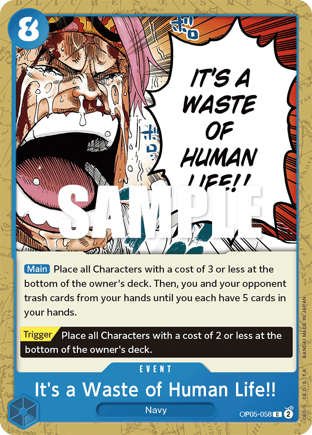 [Main] Place all Characters with a cost of 3 or less at the bottom of the owner's deck. Then, you and your opponent trash cards from your hands until you each have 5 cards in your hands. [Trigger] Place all Characters with a cost of 2 or less at the bottom of the owner's deck.