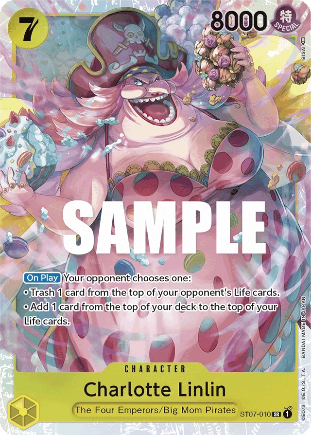 [On Play] Your opponent chooses one:• Trash 1 card from the top of your opponent's Life cards.• Add 1 card from the top of your deck to the top of your Life cards.