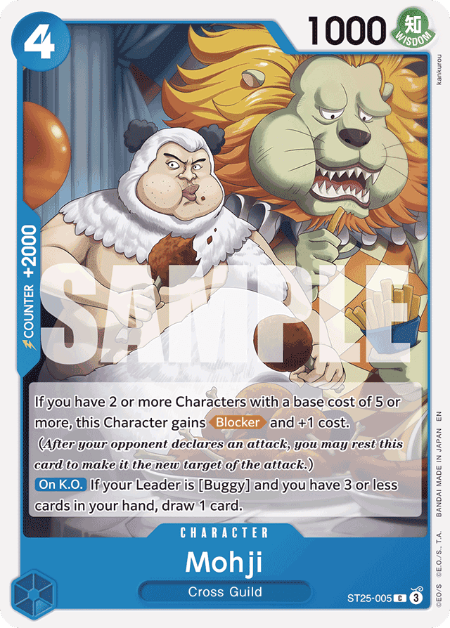 If you have 2 or more Characters with a base cost of 5 or more, this Character gains [Blocker] and +1 cost.(After your opponent declares an attack, you may rest this card to make it the new target of the attack.) [On K.O.] If your Leader is [Buggy] and you have 3 or less cards in your hand, draw 1 card.
