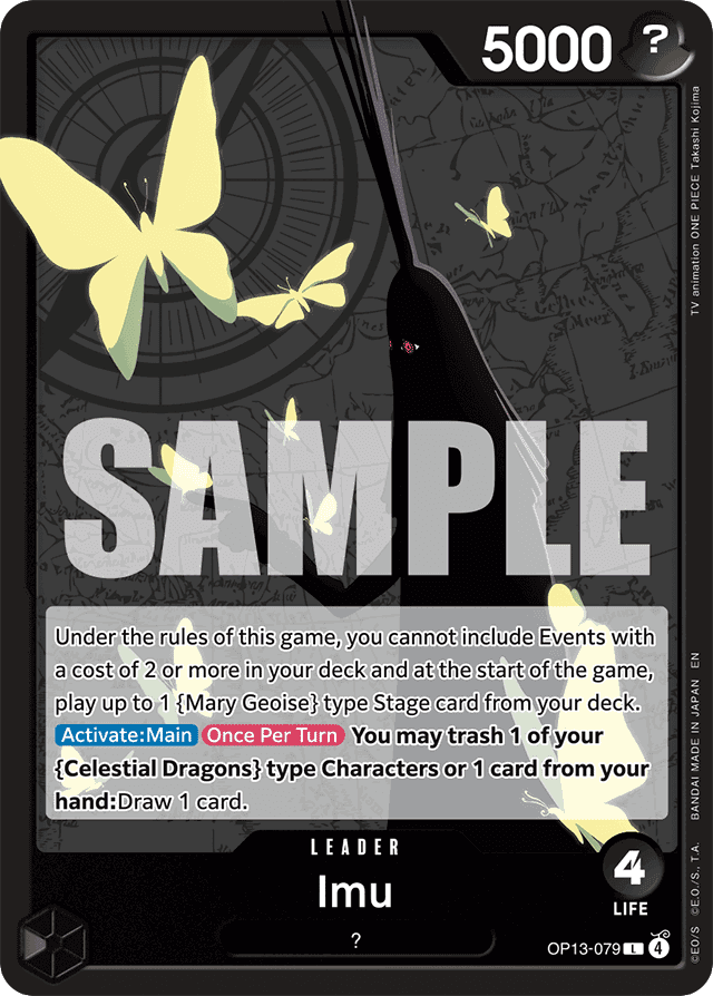 Under the rules of this game, you cannot include Events with a cost of 2 or more in your deck and at the start of the game, play up to 1 {Mary Geoise} type Stage card from your deck. [Activate: Main] [Once Per Turn] You may trash 1 of your {Celestial Dragons} type Characters or 1 card from your hand: Draw 1 card.