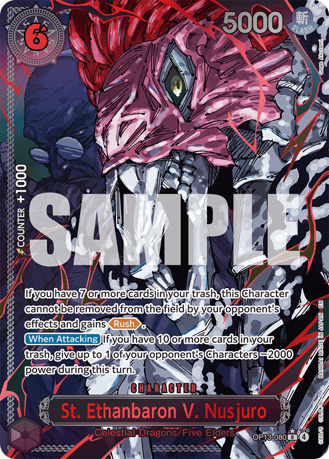 If you have 7 or more cards in your trash, this Character cannot be removed from the field by your opponent's effects and gains [Rush]. [When Attacking] If you have 10 or more cards in your trash, give up to 1 of your opponent's Characters −2000 power during this turn.