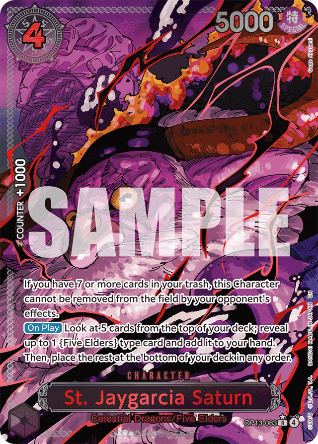 If you have 7 or more cards in your trash, this Character cannot be removed from the field by your opponent's effects. [On Play] Look at 5 cards from the top of your deck; reveal up to 1 {Five Elders} type card and add it to your hand. Then, place the rest at the bottom of your deck in any order.