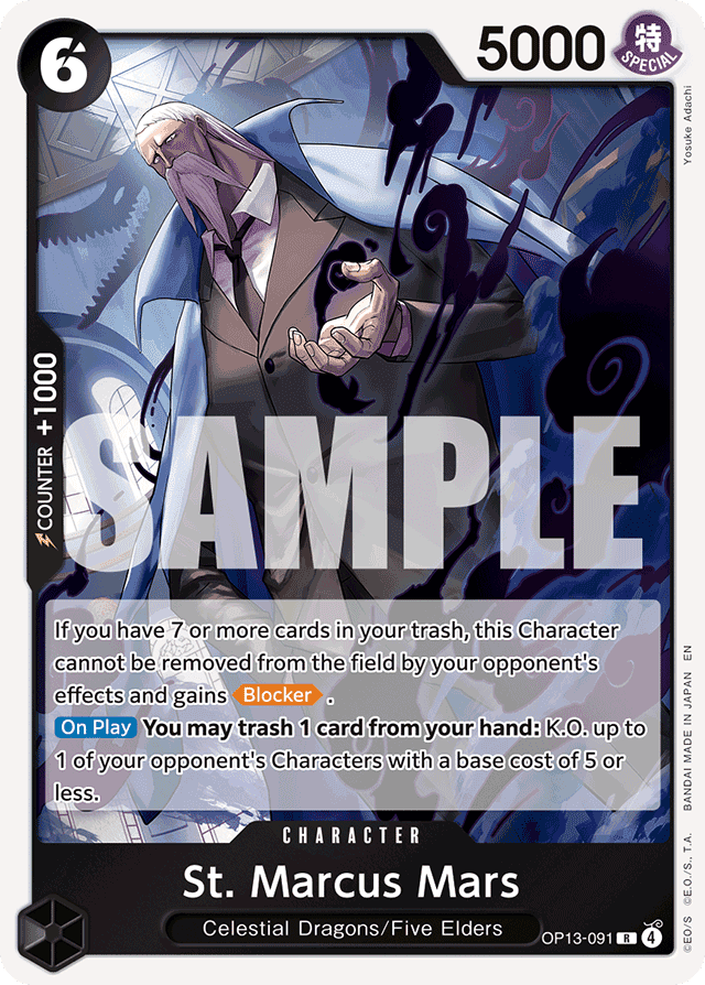 If you have 7 or more cards in your trash, this Character cannot be removed from the field by your opponent's effects and gains [Blocker]. [On Play] You may trash 1 card from your hand: K.O. up to 1 of your opponent's Characters with a base cost of 5 or less.