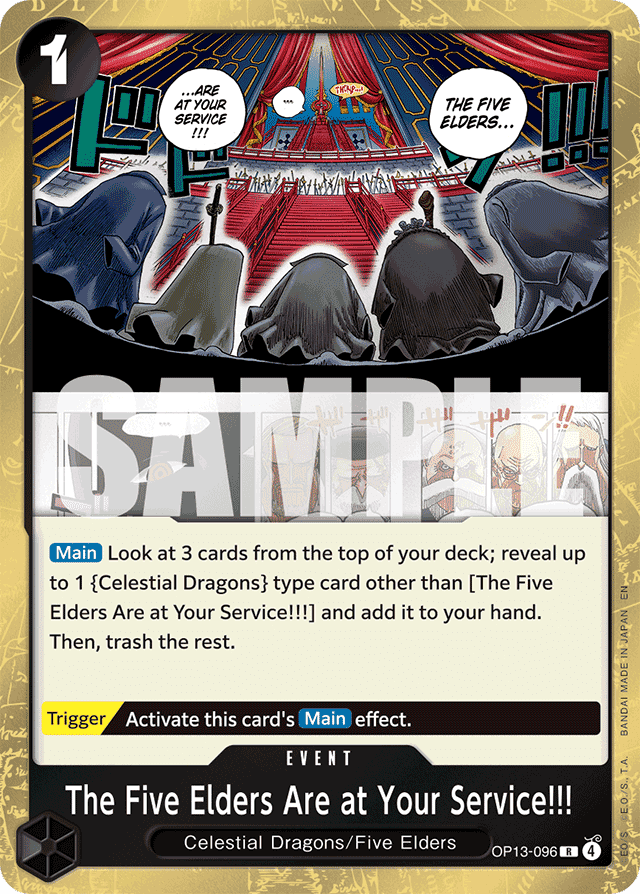[Main] Look at 3 cards from the top of your deck; reveal up to 1 {Celestial Dragons} type card other than [The Five Elders Are at Your Service!!!] and add it to your hand. Then, trash the rest. [Trigger] Activate this card's [Main] effect.