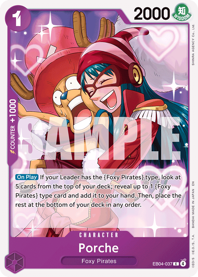 [On Play] If your Leader has the {Foxy Pirates} type, look at 5 cards from the top of your deck; reveal up to 1 {Foxy Pirates} type card and add it to your hand. Then, place the rest at the bottom of your deck in any order.