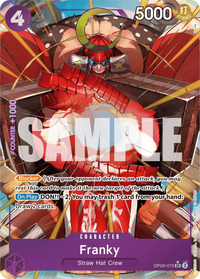 [Blocker] (After your opponent declares an attack, you may rest this card to make it the new target of the attack.) [On Play] DON!! −2, You may trash 1 card from your hand: Draw 2 cards.