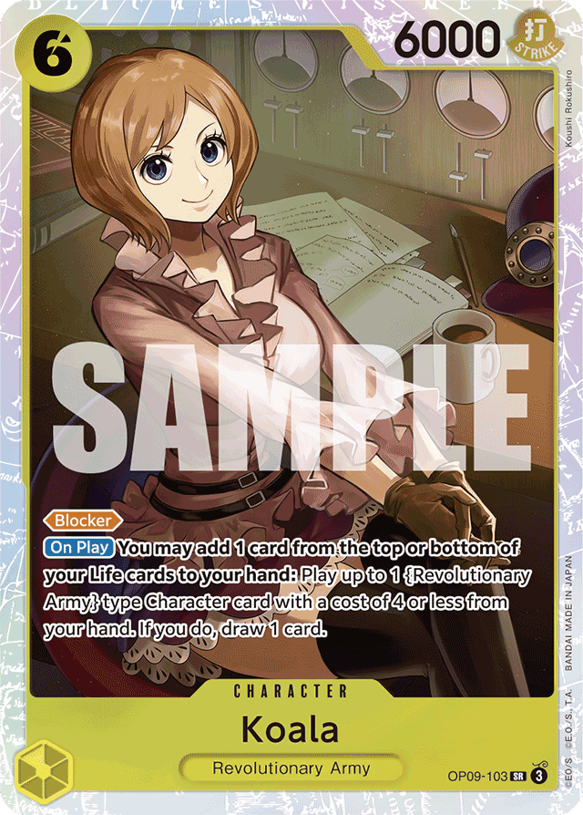 [Blocker] [On Play] You may add 1 card from the top or bottom of your Life cards to your hand: Play up to 1 {Revolutionary Army} type Character card with a cost of 4 or less from your hand. If you do, draw 1 card.