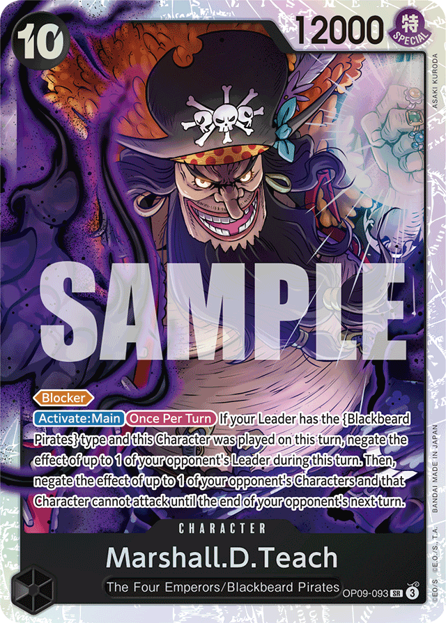 [Blocker] [Activate: Main] [Once Per Turn] If your Leader has the {Blackbeard Pirates} type and this Character was played on this turn, negate the effect of up to 1 of your opponent's Leader during this turn. Then, negate the effect of up to 1 of your opponent's Characters and that Character cannot attack until the end of your opponent's next turn.