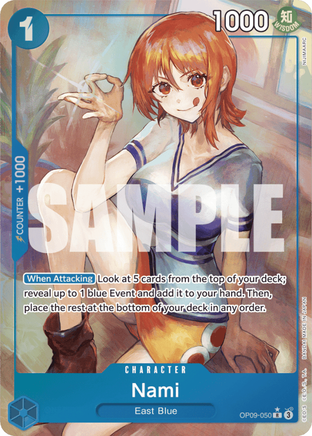 [When Attacking] Look at 5 cards from the top of your deck; reveal up to 1 blue Event and add it to your hand. Then, place the rest at the bottom of your deck in any order.