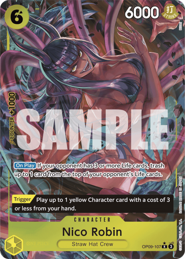 [On Play] If your opponent has 3 or more Life cards, trash up to 1 card from the top of your opponent's Life cards. [Trigger] Play up to 1 yellow Character card with a cost of 3 or less from your hand.