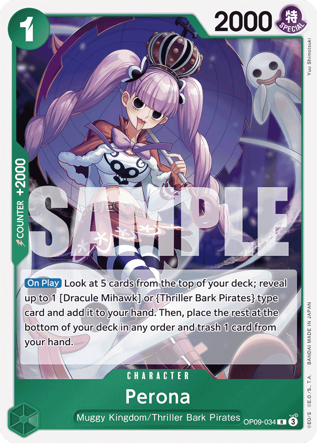 [On Play] Look at 5 cards from the top of your deck; reveal up to 1 [Dracule Mihawk] or {Thriller Bark Pirates} type card and add it to your hand. Then, place the rest at the bottom of your deck in any order and trash 1 card from your hand.