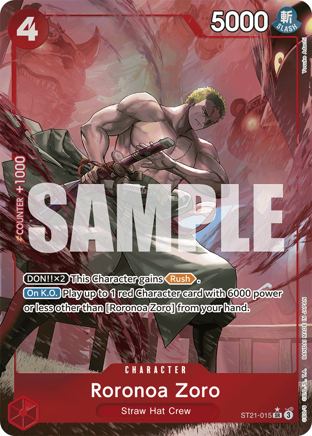 [DON!! x2] This Character gains [Rush]. [On K.O.] Play up to 1 red Character card with 6000 power or less other than [Roronoa Zoro] from your hand.