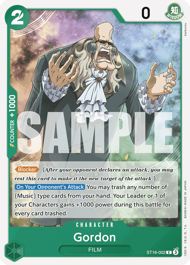 [Blocker] (After your opponent declares an attack, you may rest this card to make it the new target of the attack.) [On Your Opponent's Attack] You may trash any number of {Music} type cards from your hand. Your Leader or 1 of your Characters gains +1000 power during this battle for every card trashed.