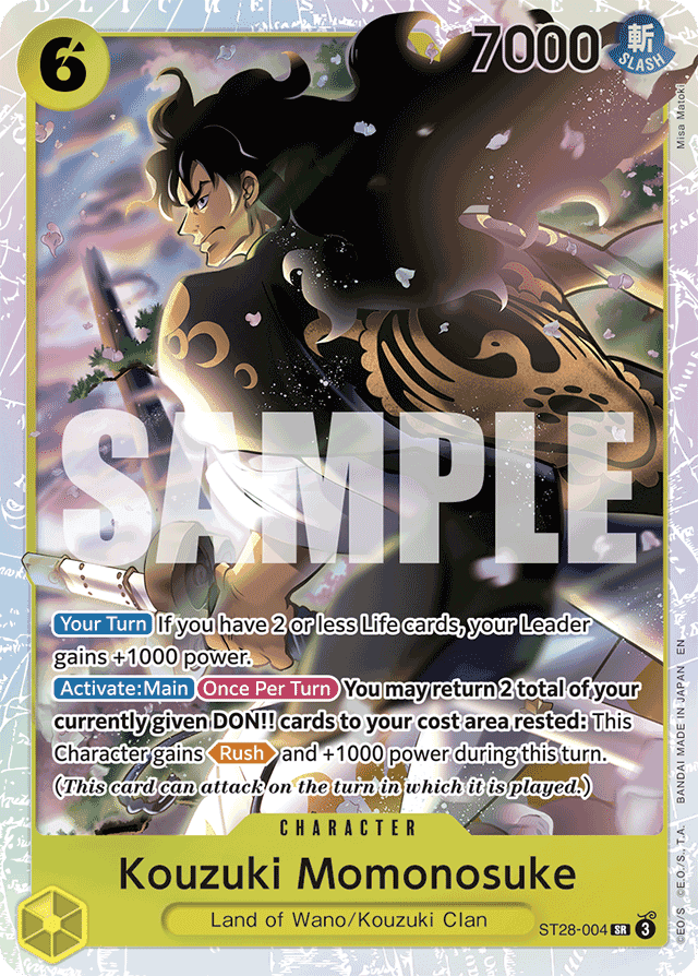 [Your Turn] If you have 2 or less Life cards, your Leader gains +1000 power. [Activate: Main] [Once Per Turn] You may return 2 total of your currently given DON!! cards to your cost area rested: This Character gains [Rush] and +1000 power during this turn.(This card can attack on the turn in which it is played.)