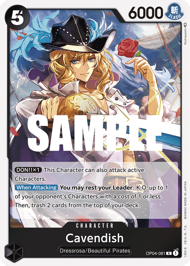 [DON!! x1] This Character can also attack active Characters. [When Attacking] You may rest your Leader: K.O. up to 1 of your opponent's Characters with a cost of 1 or less. Then, trash 2 cards from the top of your deck.