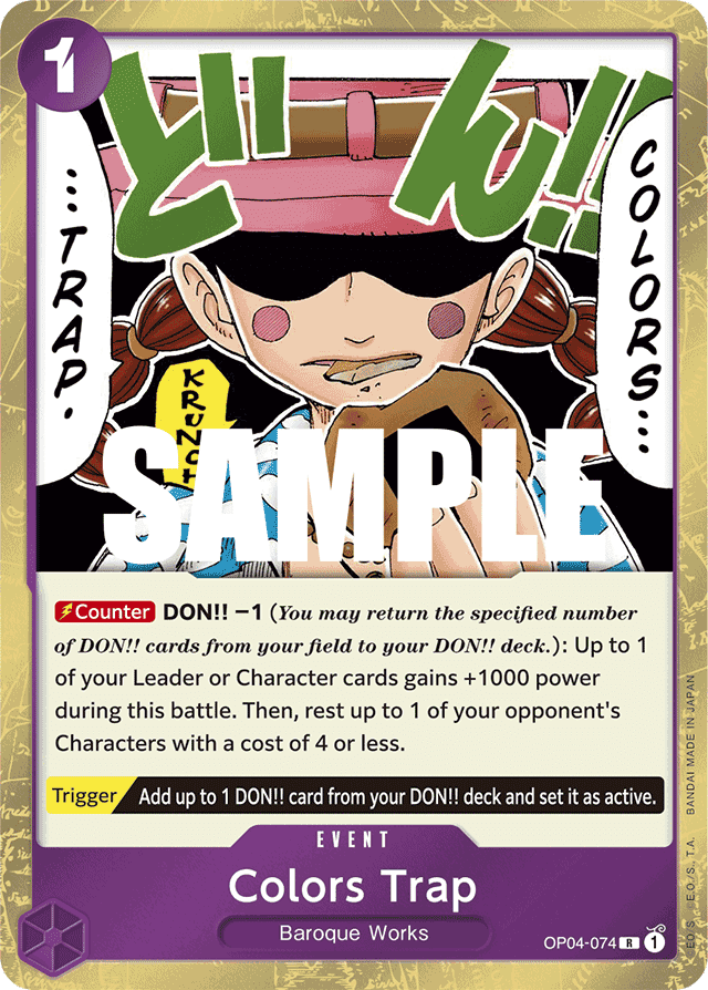 [Counter] DON!! −1 (You may return the specified number of DON!! cards from your field to your DON!! deck.): Up to 1 of your Leader or Character cards gains +1000 power during this battle. Then, rest up to 1 of your opponent's Characters with a cost of 4 or less. [Trigger] Add up to 1 DON!! card from your DON!! deck and set it as active.