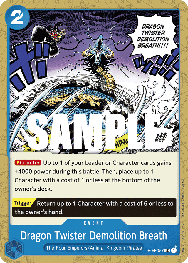 [Counter] Up to 1 of your Leader or Character cards gains +4000 power during this battle. Then, place up to 1 Character with a cost of 1 or less at the bottom of the owner's deck. [Trigger] Return up to 1 Character with a cost of 6 or less to the owner's hand.