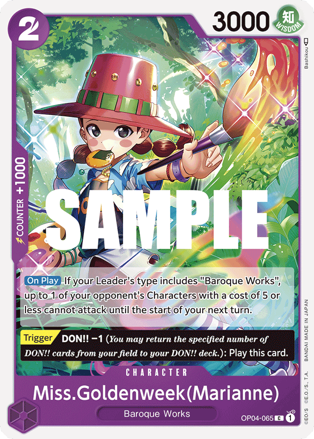 [On Play] If your Leader's type includes "Baroque Works", up to 1 of your opponent's Characters with a cost of 5 or less cannot attack until the start of your next turn. [Trigger] DON!! −1 (You may return the specified number of DON!! cards from your field to your DON!! deck.): Play this card.
